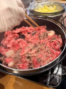 出来上がったすき焼きを召し上がりながら